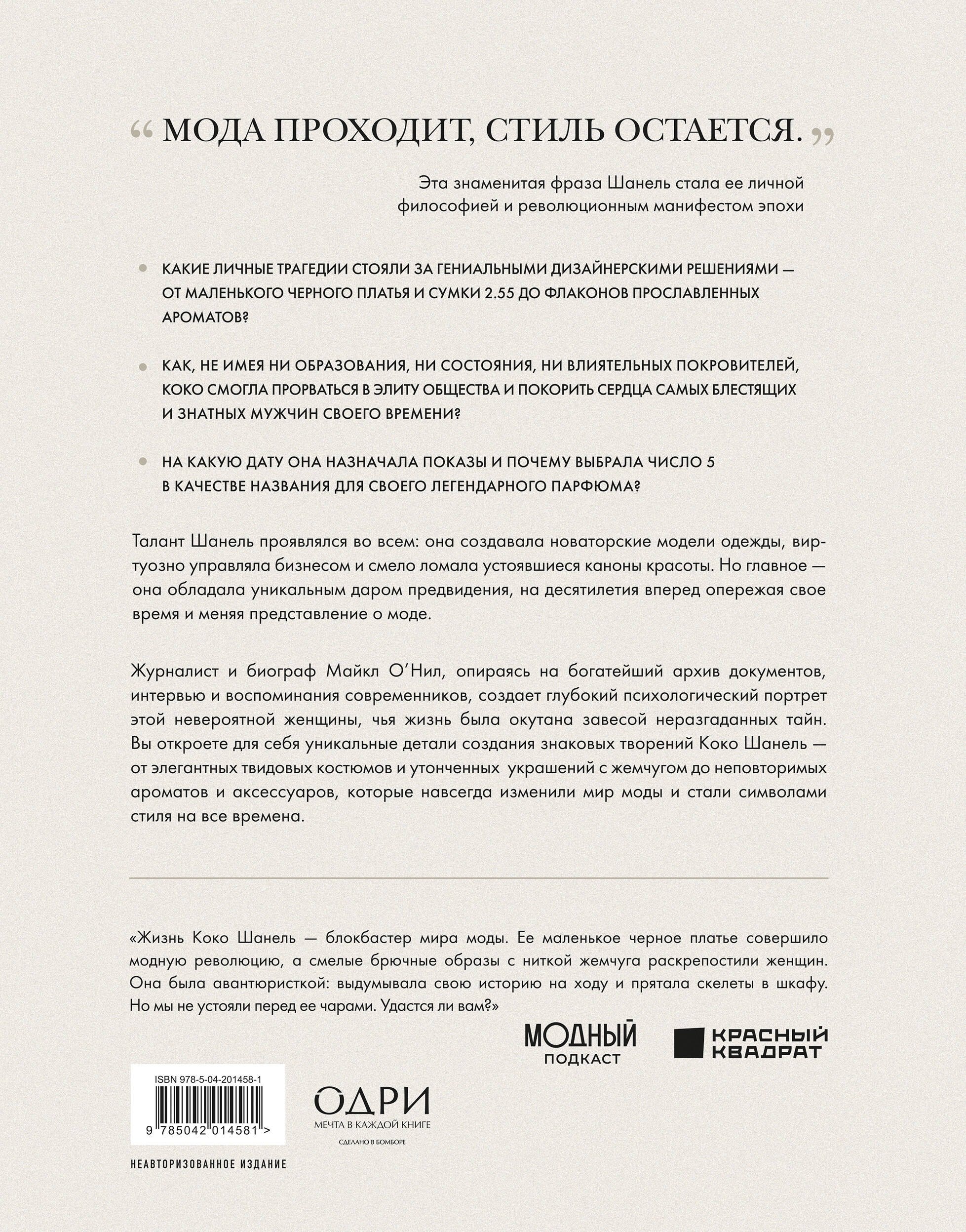 Эта книга — не просто биография, а глубокий психологический портрет женщины, которая превратила свою жизнь в легенду и сделала моду и стиль формой высказывания. Перед вами — история о таланте и невероятной силе характера. На основе архивов, писем и редких интервью автор книги Майкл О’Нил воссоздает живой образ великой Мадемуазель — дерзкой, независимой, непредсказуемой. Вы откройте для себя уникальные детали создания знаковых творений Коко Шанель — от элегантных твидовых костюмов и утонченных украшений с жемчугом до неповторимых ароматов и аксессуаров, которые навсегда изменили мир моды и стали символами стиля на все времена.