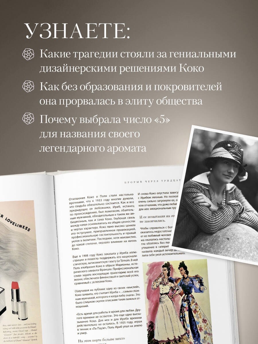 Мелованная бумага, редкие иллюстрации, стильная обложка, подарочное издание, эксклюзивные подробности создания культовых символов дома Chanel. Книга будет интересна всем, кто увлекается историей, интересуется миром моды и красоты.