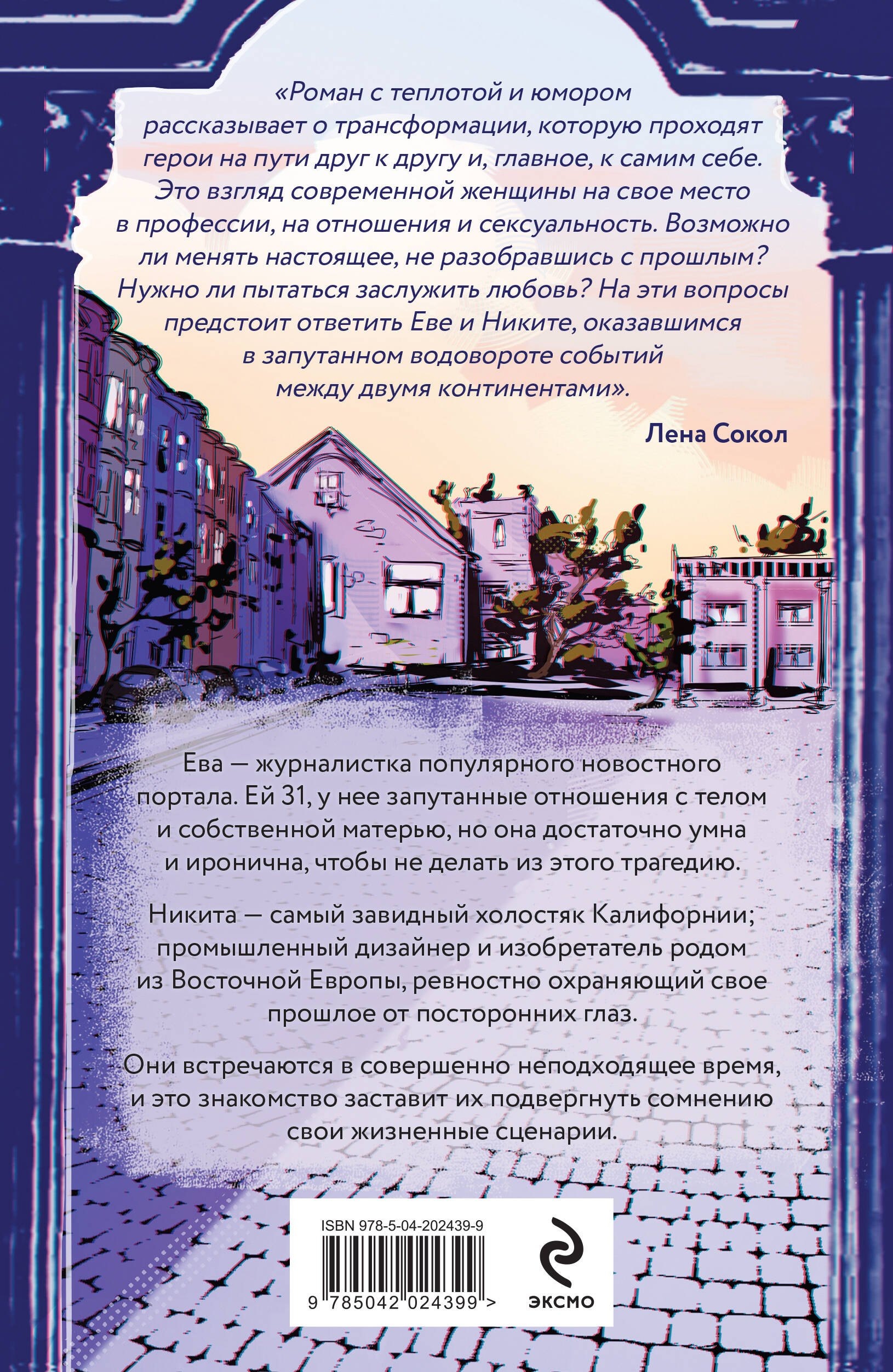 «Роман с теплотой и юмором рассказывает о трансформации, которую проходят герои на пути друг к другу и, главное, к самим себе. Это взгляд современной женщины на свое место в профессии, на отношения и сексуальность. Возможно ли менять настоящее, не разобравшись с прошлым? Нужно ли пытаться заслужить любовь? На эти вопросы предстоит ответить Еве и Никите, оказавшись в запутанном водовороте событий между двумя континентами». — Лена Сокол