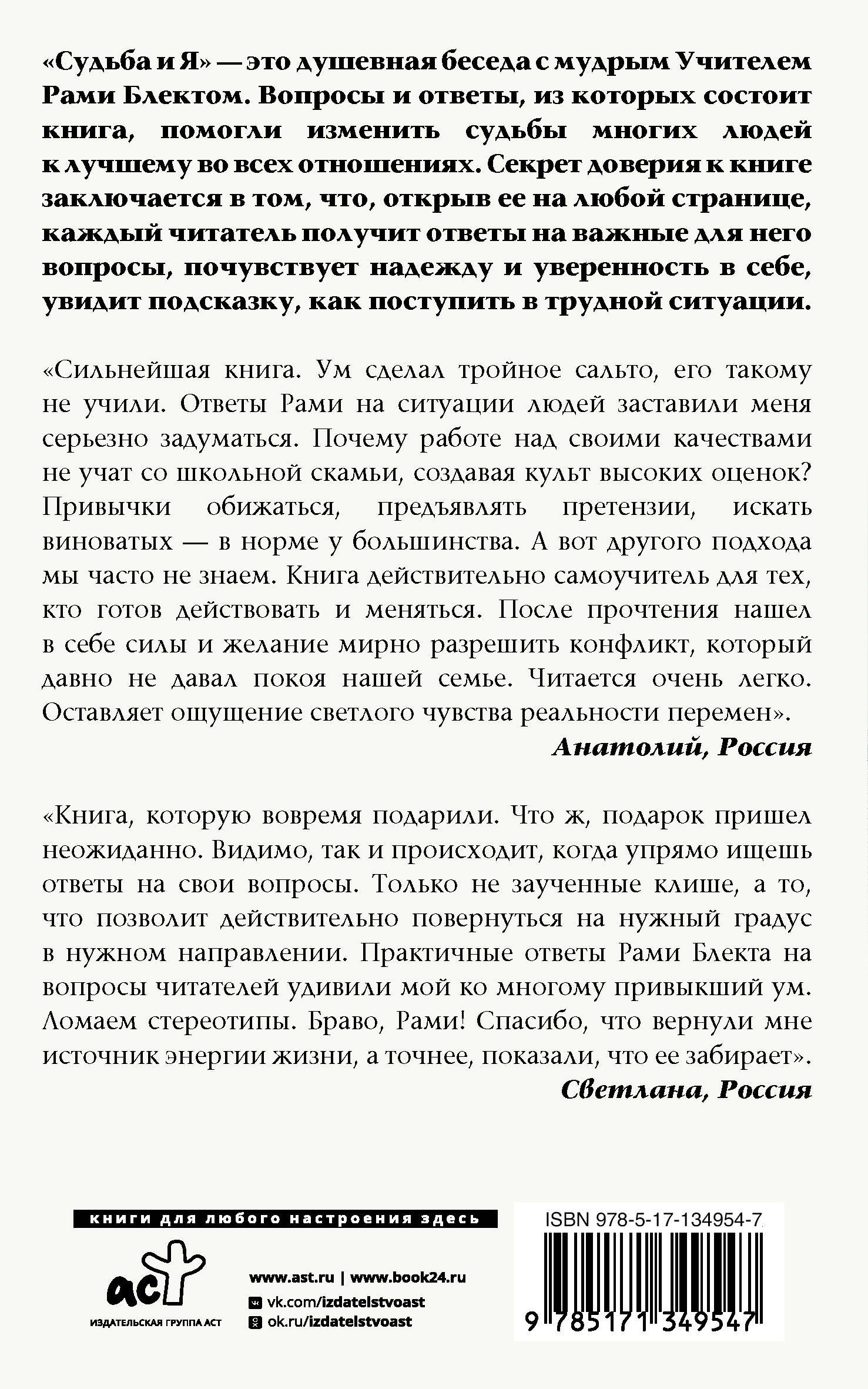 «Судьба и Я» — это душевная беседа с мудрым Учителем Рами Блектом. Вопросы и ответы, из которых состоит книга, помогли изменить судьбы многих людей к лучшему во всех отношениях. Секрет доверия к книге заключается в том, что, открыв ее на любой странице, каждый читатель получит ответы на важные для него вопросы, почувствует надежду и уверенность в себе, увидит подсказку, как поступить в трудной ситуации.