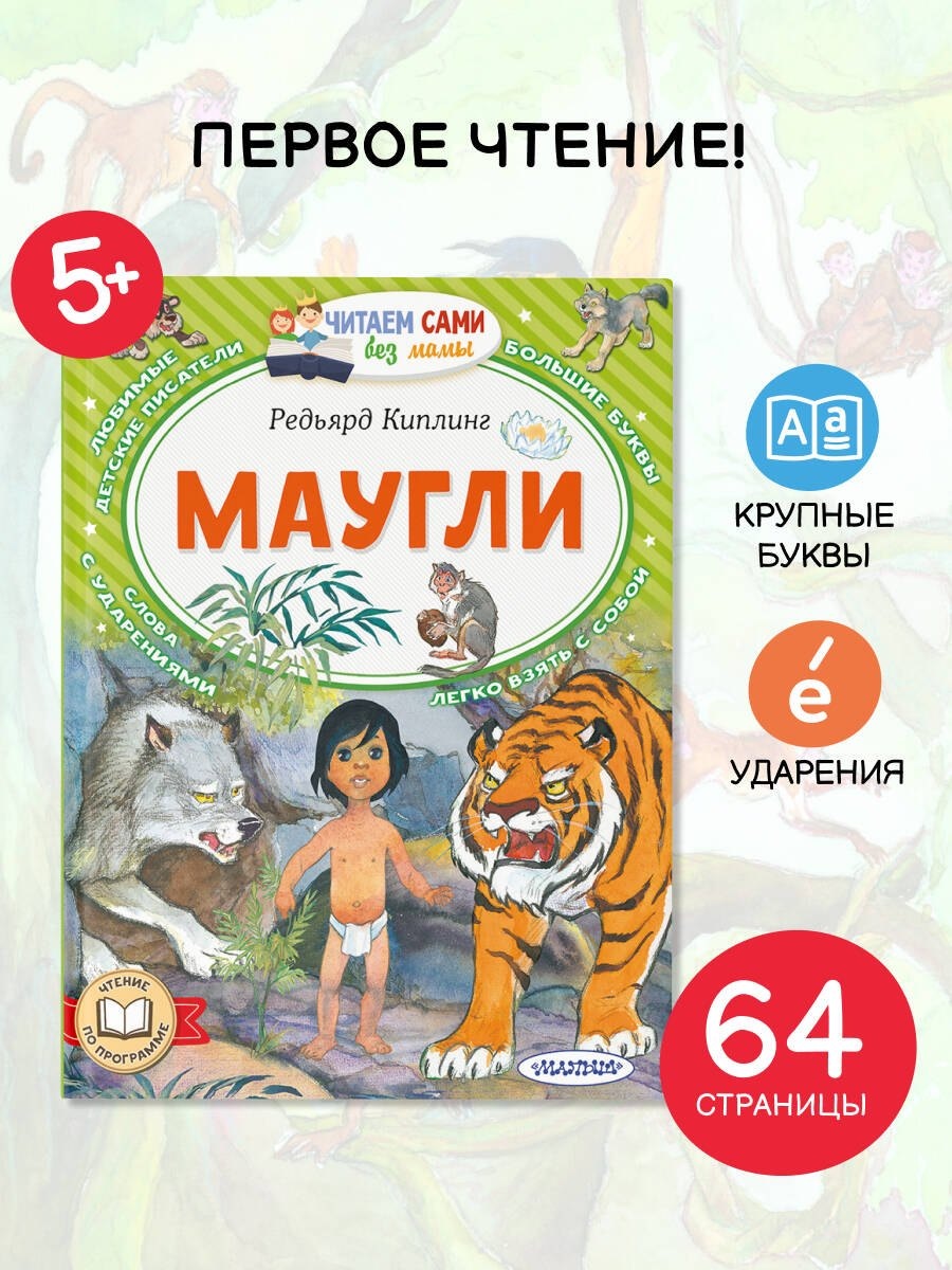Книга ориентирована на старших дошкольников, начинающих читать самостоятельно и переходящих от слогового к чтению целыми словами. Крупный шрифт, ударения, яркие иллюстрации помогут лучше погрузиться в историю и без помощи взрослых прочитать знаменитое произведение. Захватывающая история о приключениях Маугли обязательно понравится вашему малышу и поможет развить интерес к чтению.