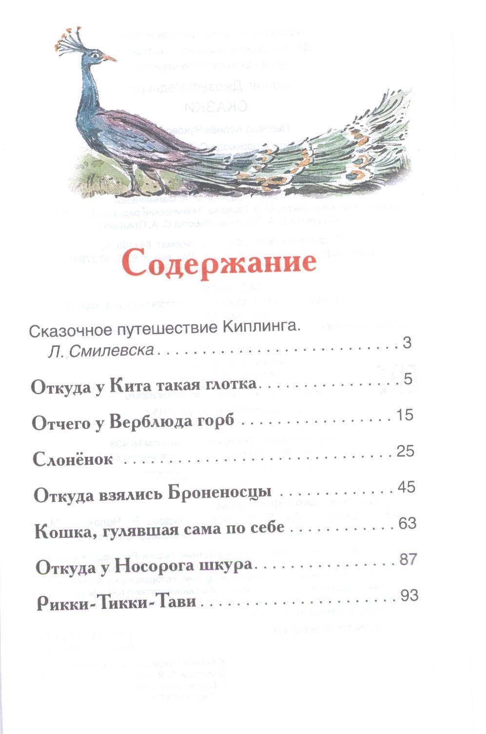 В книгу вошли сказки Р. Киплинга в классическом переводе К. Чуковского: «Откуда у Кита такая глотка», «Отчего у Верблюда горб», «Слонёнок», «Откуда взялись Броненосцы», «Кошка, гулявшая сама по себе», «Откуда у Носорога шкура», «Рикки-Тикки-Тави».
