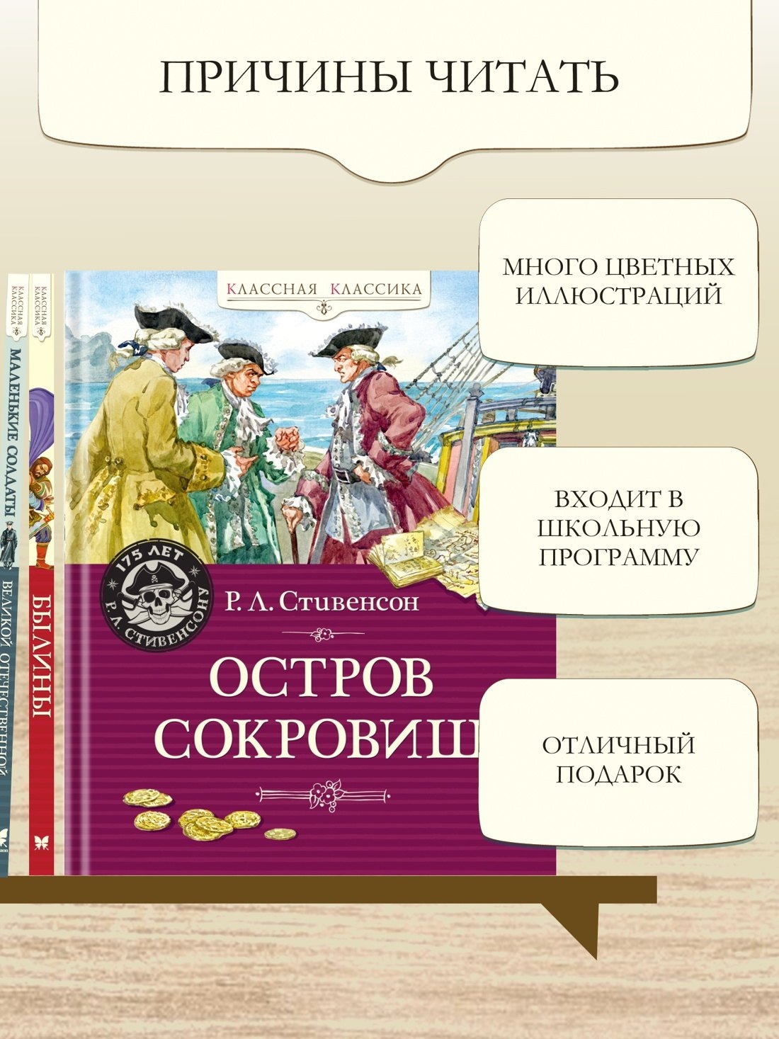 «Остров Сокровищ» - знаменитый роман Роберта Льюиса Стивенсона, который перенесёт читателей в мир пиратов, несметных богатств и опасных приключений. Когда юный Джим Хокинс находит карту сокровищ, он даже не представляет, какое путешествие ему предстоит… Вместе с командой опытных моряков юнга отправится на загадочный необитаемый остров, раскроет коварный план заговорщиков и не раз спасёт жизнь себе и своим друзьям! Произведения Роберта Льюиса Стивенсона входят в программу внеклассного чтения.