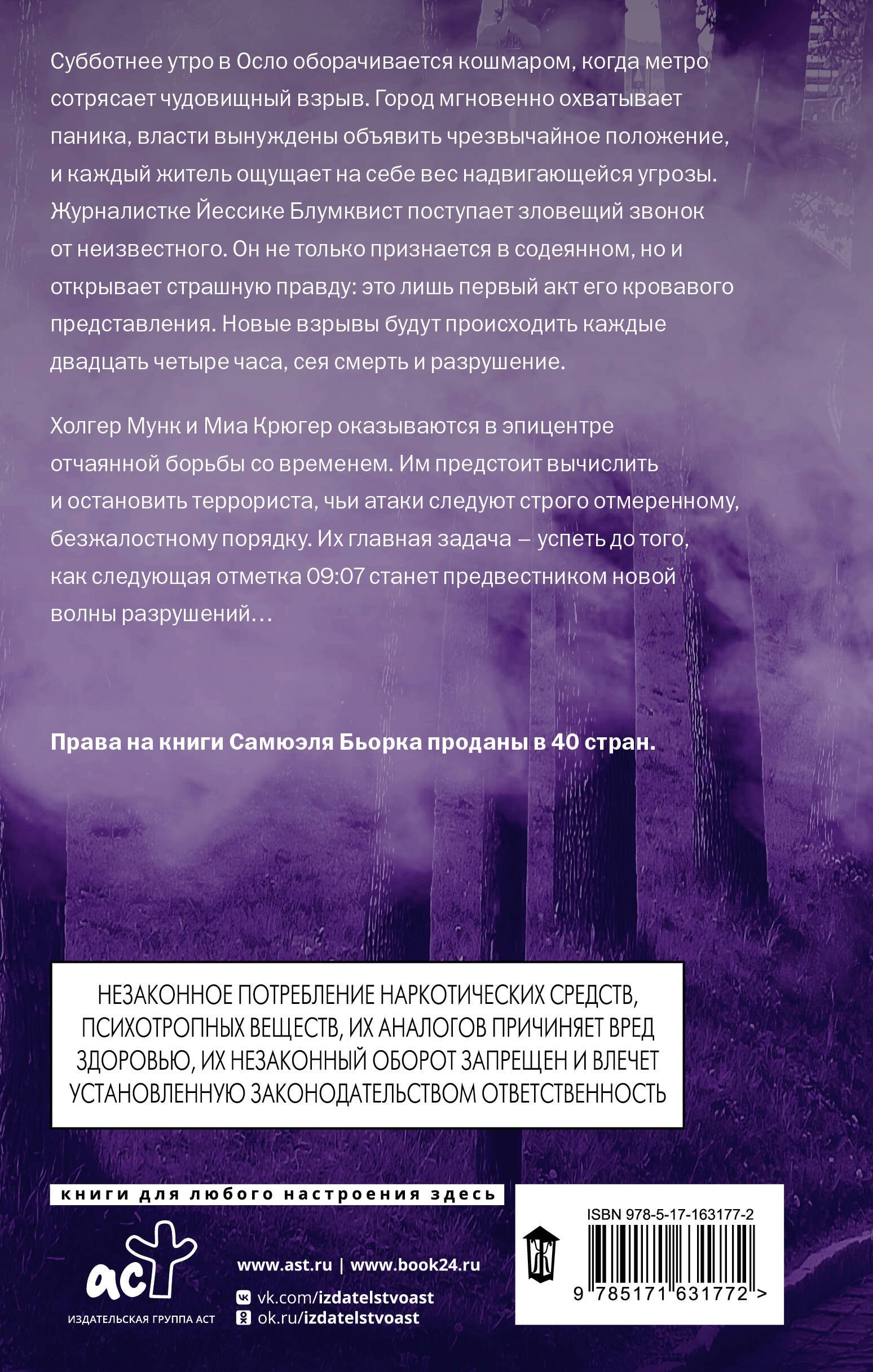 Холгер Мунк и Миа Крюгер оказываются в эпицентре отчаянной борьбы со временем. Им предстоит вычислить и остановить террориста, чьи атаки следуют строго отмеренному, безжалостному порядку. Их главная задача – успеть до того, как следующая отметка 09:07 станет предвестником новой волны разрушений…