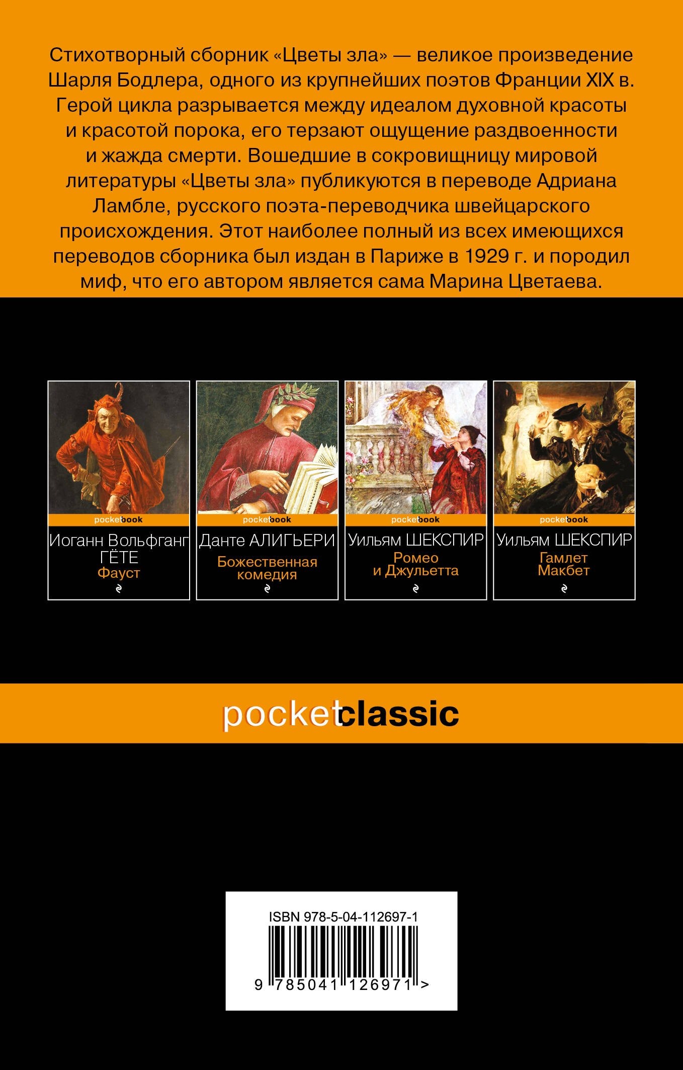 Стихотворный сборник «Цветы зла» — великое произведение Шарля Бодлера, одного из крупнейших поэтов Франции XIX века. Герой цикла разрывается между идеалом духовной красоты и красотой порока, его терзают ощущение раздвоенности и жажда смерти. Вошедшие в сокровищницу мировой литературы «Цветы зла» публикуются в переводе Адриана Ламбле, русского поэта-переводчика швейцарского происхождения. Этот наиболее полный из всех имеющихся переводов сборника был издан в Париже в 1929 г. и породил миф, что его автором является сама Марина Цветаева.