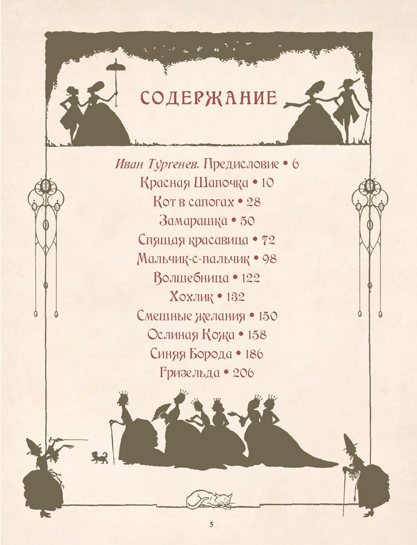 Во-первых, девять самых знаменитых сказок Перро («Красная Шапочка», «Спя-щая красавица», «Кот в сапогах», «Мальчик-с-Пальчик» и т. д.) публикуются в пере-воде русского классика — Ивана Тургенева.