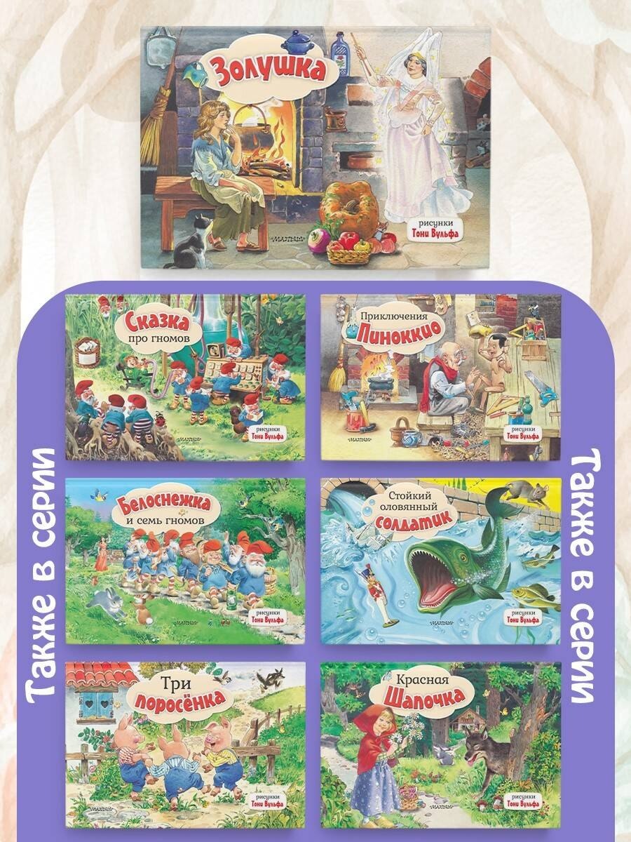 Серия "Книжка-панорамка" – идеальный подарок для маленьких читателей. Любимые сказки оживают в иллюстрациях знаменитого художника Тони Вульфа: Золушка и Белоснежка, Красная Шапочка и Три поросëнка и многие другие герои готовы встретиться с малышом и рассказать ему свои истории.