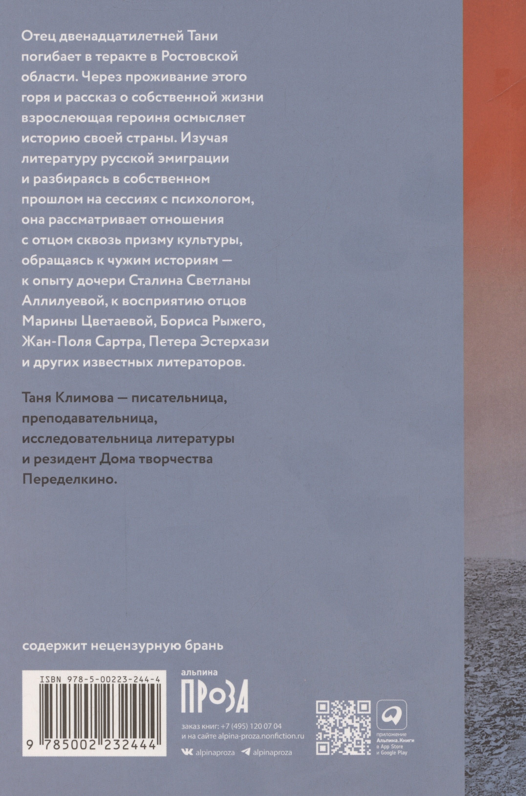 Отец двенадцатилетней Тани погибает в теракте в Ростовской области. Через проживание этого горя и рассказ о собственной жизни взрослеющая героиня осмысляет историю своей страны. Изучая литературу русской эмиграции и разбираясь в собственном прошлом на сессиях с психологом, она рассматривает отношения с отцом сквозь призму культуры, обращаясь к чужим историям — к опыту дочери Сталина Светланы Аллилуевой, к восприятию отцов Марины Цветаевой, Бориса Рыжего, Жан-Поля Сартра, Петера Эстерхази и других известных литераторов.