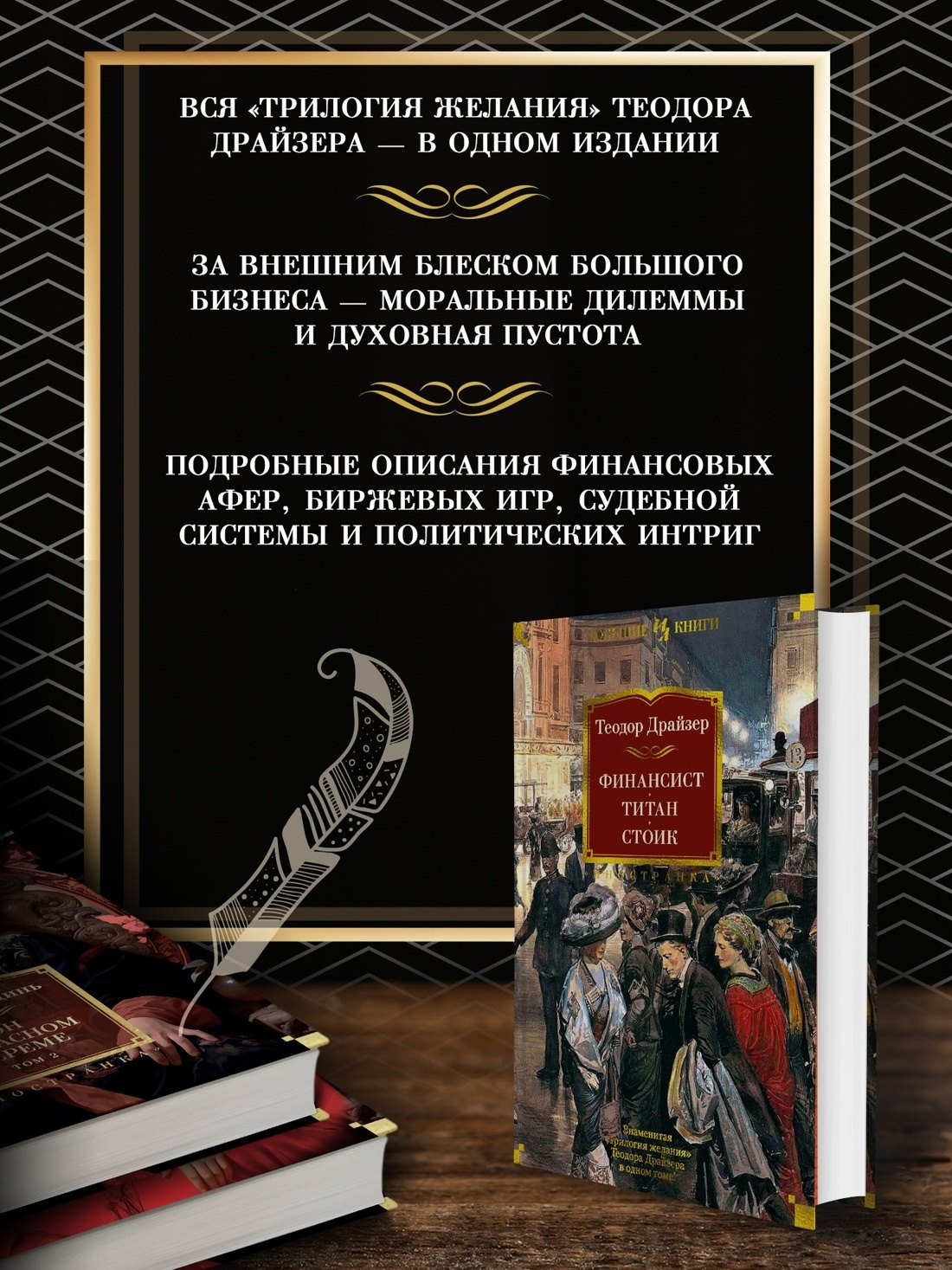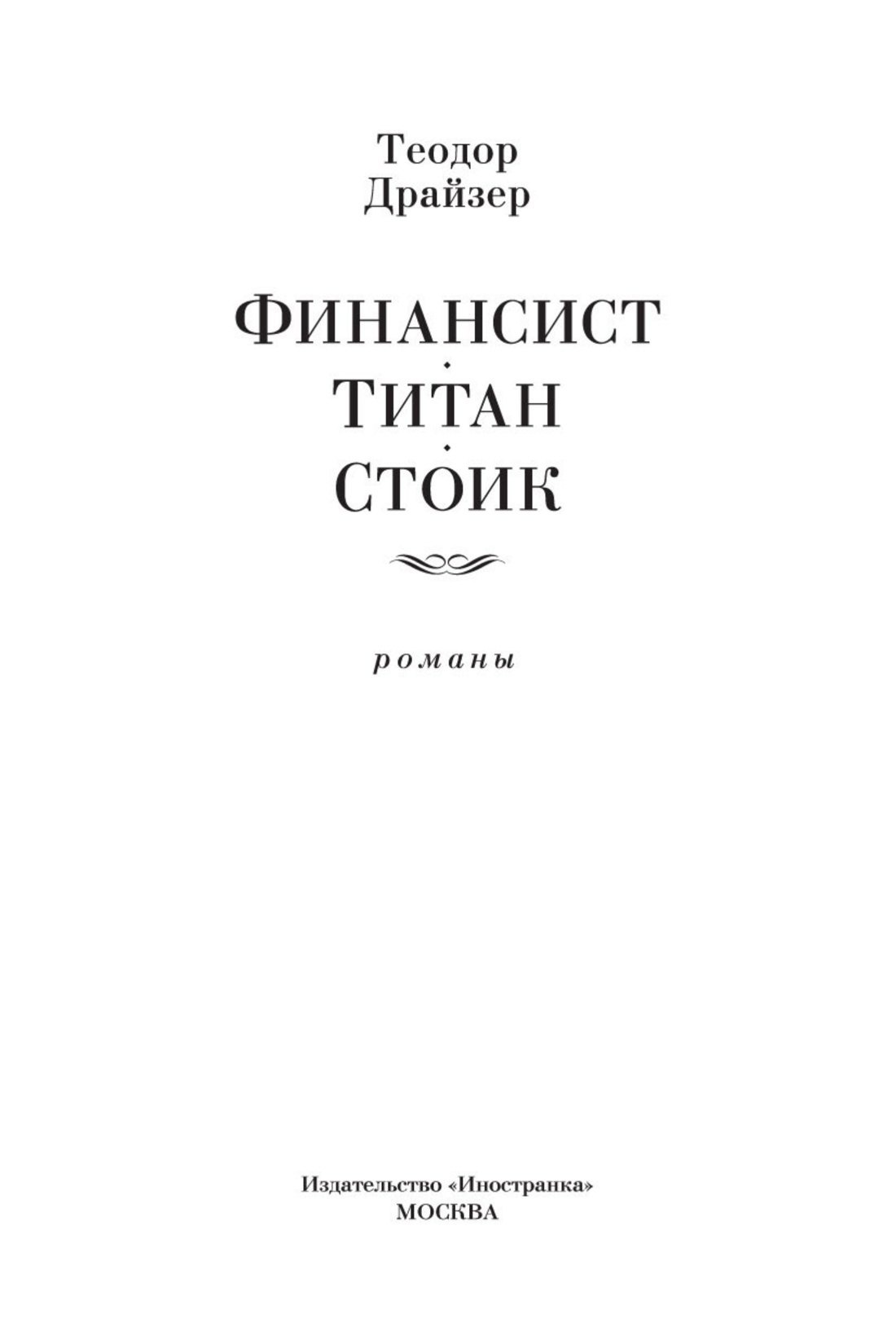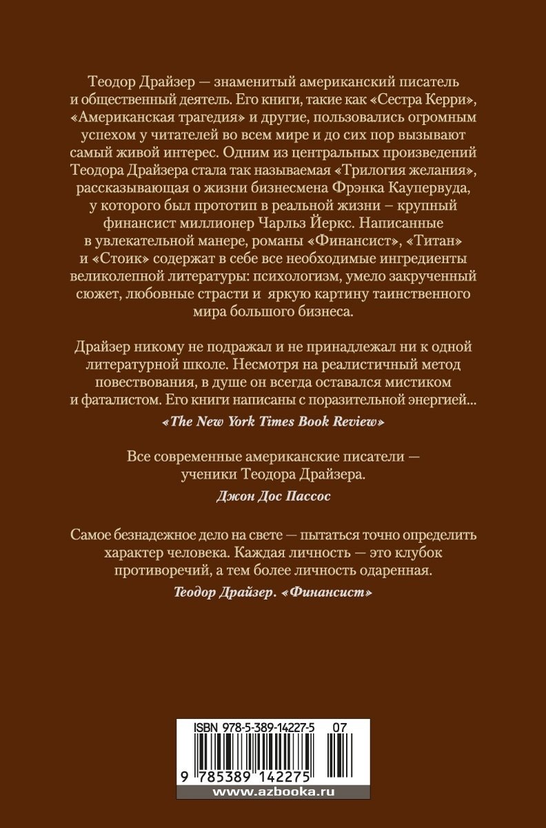 Теодор Драйзер — знаменитый американский писатель и общественный деятель. Его книги, такие как «Американская трагедия», «Сестра Кэрри» и другие, пользовались огромным успехом у читателей во всем мире и до сих пор вызывают самый живой интерес. Одним из центральных произведений Теодора Драйзера стала так называемая «Трилогия желания», рассказывающая о жизни бизнесмена Фрэнка Каупервуда, у которого был прототип в реальной жизни – крупный финансист миллионер Чарльз Йеркс. Написанные в увлекательной манере, романы «Финансист», «Титан» и «Стоик» содержат в себе все необходимые ингредиенты великолепной литературы: психологизм, умело закрученный сюжет, любовные страсти и яркую картину таинственного мира большого бизнеса.