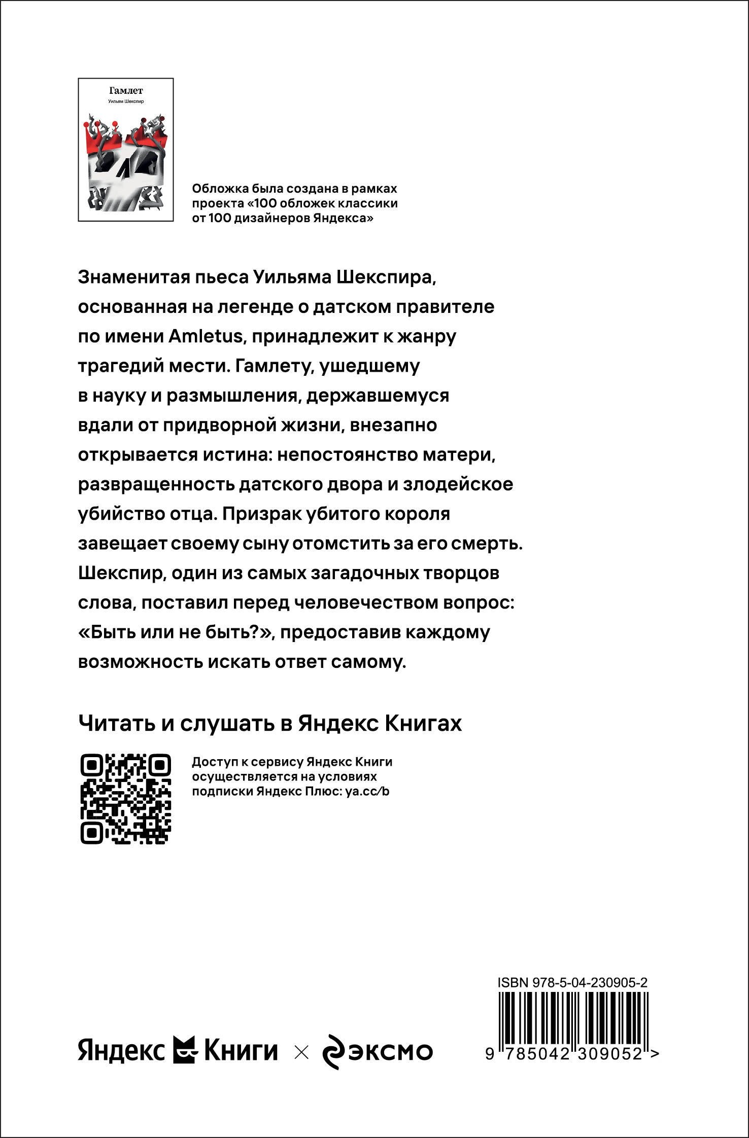 Знаменитая пьеса Уильяма Шекспира, основанная на легенде о датском правителе по имени Amletus, принадлежит к жанру трагедий мести. Гамлету, ушедшему в науку и размышления, державшемуся вдали от придворной жизни, внезапно открывается непостоянство матери, развращенность датского двора и злодейское убийство отца. Призрак убитого короля завещает своему сыну отомстить за его смерть.