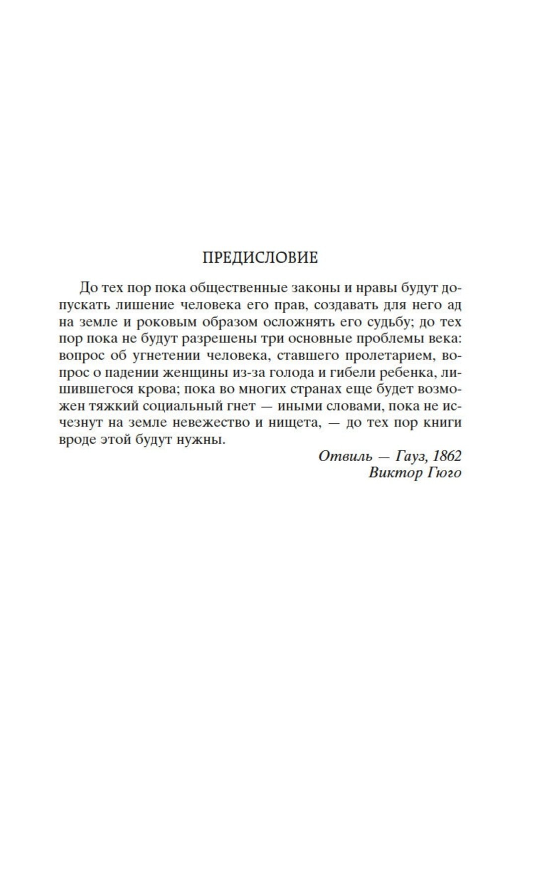 Роман-эпопея Виктора Гюго «Отверженные» (1862) — огромный текст, без которого невозможно представить себе духовную историю XIX века. В сущности, это «война и мир» великого французского классика, только здесь находит отражение не противостояние вражеских армий, но война, которую ведут между собой добро и зло в человеческой душе и в обществе. При создании «Отверженных» автора, по его словам, прежде всего волновали три темы: «угнетение мужчины... падение женщины по причине голода, увядание ребенка вследствие мрака невежества», что отразилось в историях главных действующих лиц: каторжника Жана Вальжана, Фантины и Козетты. Фантастически закрученная авантюрная фабула заставляет следить с неотрывным вниманием за событиями, которые разворачиваются на улицах старого Парижа, в трущобах и на баррикадах. Не случайно, в XX веке насчитываются десятки экранизаций «Отверженных» — от немой ленты «На баррикадах» (1907) до последнего фильма Тома Хупера.