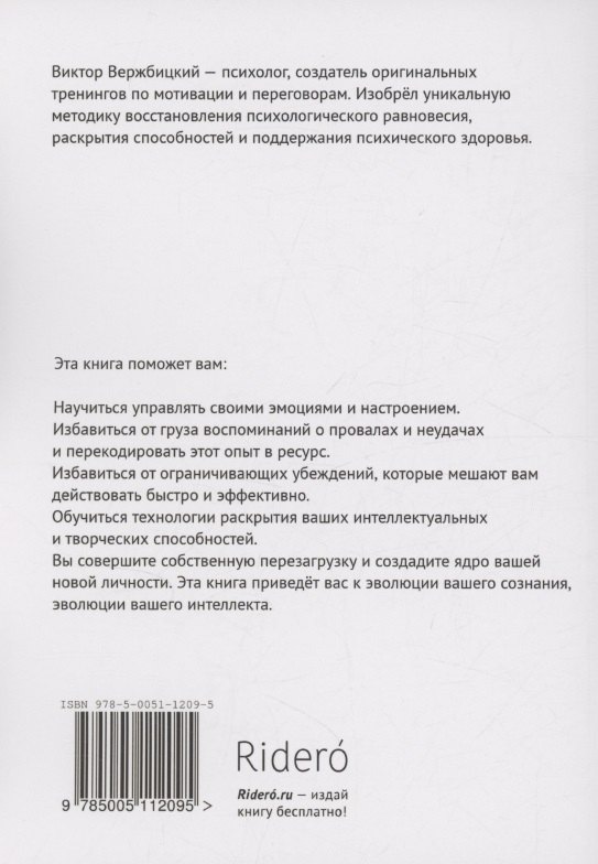 Вы совершите собственную перезагрузку и создадите ядро вашей новой личности. Эта книга приведёт вас к эволюции вашего сознания, эволюции вашего интеллекта.