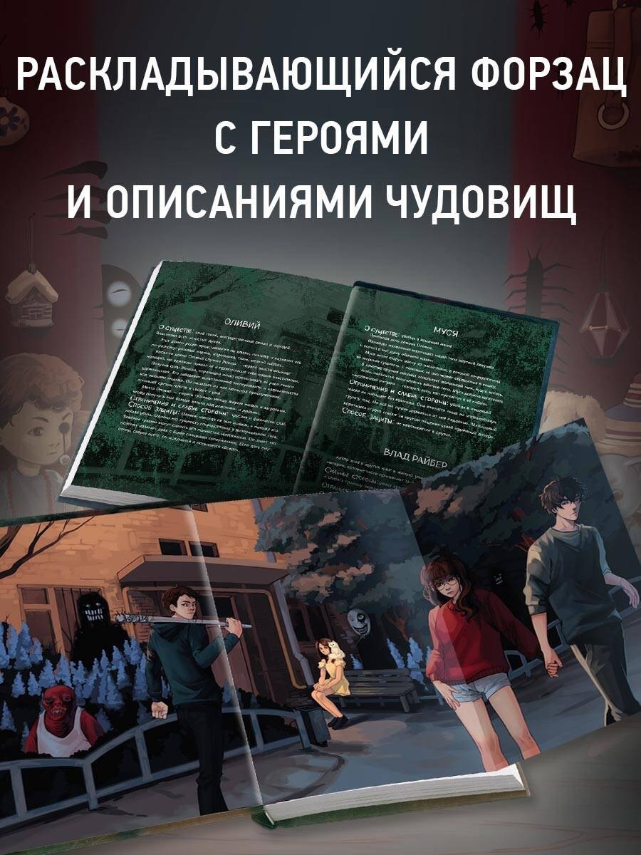 Атмосферное серийное оформление — соберите целую полку страшных историй от автора! Внутри красочные форзацы с изображениями и досье монстров, необычное внутреннее оформление с записками, иллюстрациями и пометками.
