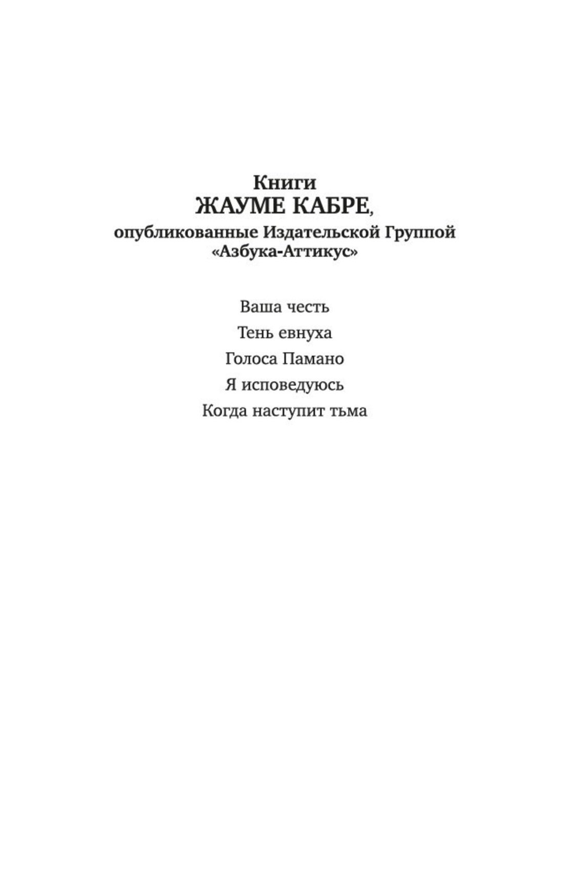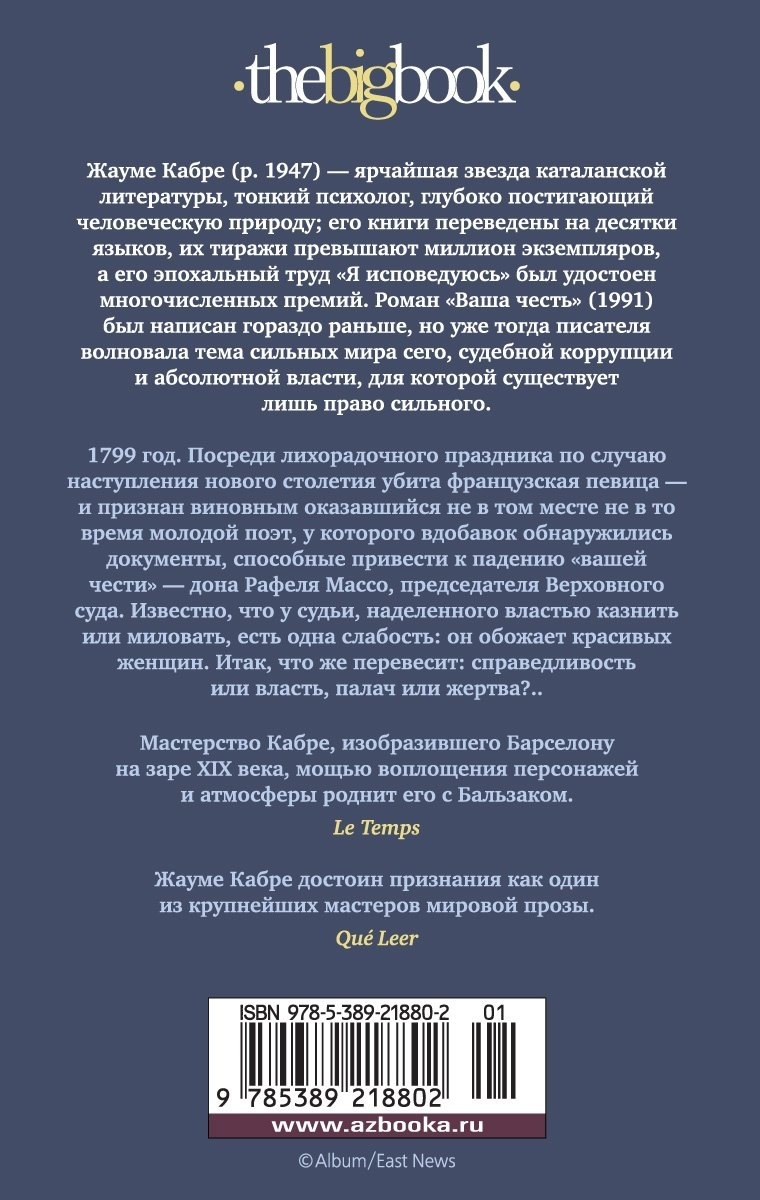 Жауме Кабре (р. 1947) — ярчайшая звезда каталанской литературы, сценарист, филолог, тонкий психолог, глубоко постигающий человеческую природу; его книги переведены на десятки языков, их тиражи превышают миллион экземпляров, а его эпохальный труд «Я исповедуюсь» был удостоен многочисленных премий. Роман «Ваша честь» (1991) был написан гораздо раньше, но уже тогда писателя волновала тема сильных мира сего, судебной коррупции и абсолютной власти, для которой существует лишь право сильного. Зима 1799 года. В Барселоне затяжные дожди, город словно парализовало, но светская жизнь в самом разгаре. Кажется, у аристократов одна забота: как отпраздновать наступление нового XIX века. В кафедральном соборе исполняют Te Deum, в роскошных залах разворачивается череда приемов... Однако праздничную атмосферу омрачает странное убийство французской певицы — и арестован молодой поэт, случайно оказавшийся не в том месте не в то время. Он безоговорочно признан виновным, тем более что у него обнаружились документы, которые могут привести к падению «вашей чести» — дона Рафеля Массо, председателя Верховного суда. Известно, что у судьи, наделенного властью казнить или миловать, есть одна слабость: он обожает красивых женщин. Так что же перевесит: справедливость или власть, палач или жертва, «Я ее не убивал!» одного или «Я этого не хотел» другого?..